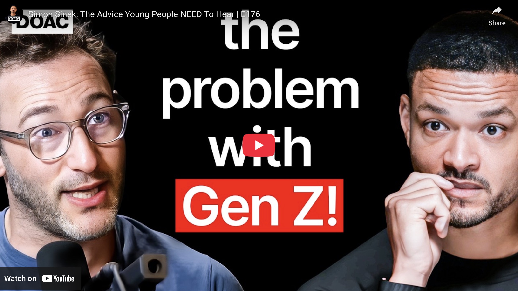 In deze video deelt Simon Sinek vrij directe en waardevolle inzichten voor jonge mensen die hun weg zoeken in een snel veranderende wereld. De opname komt uit een aflevering van The Diary of a CEO waarin Sinek reflecteert op de uitdagingen van Generatie Z, werk, relaties en persoonlijke ontwikkeling.
